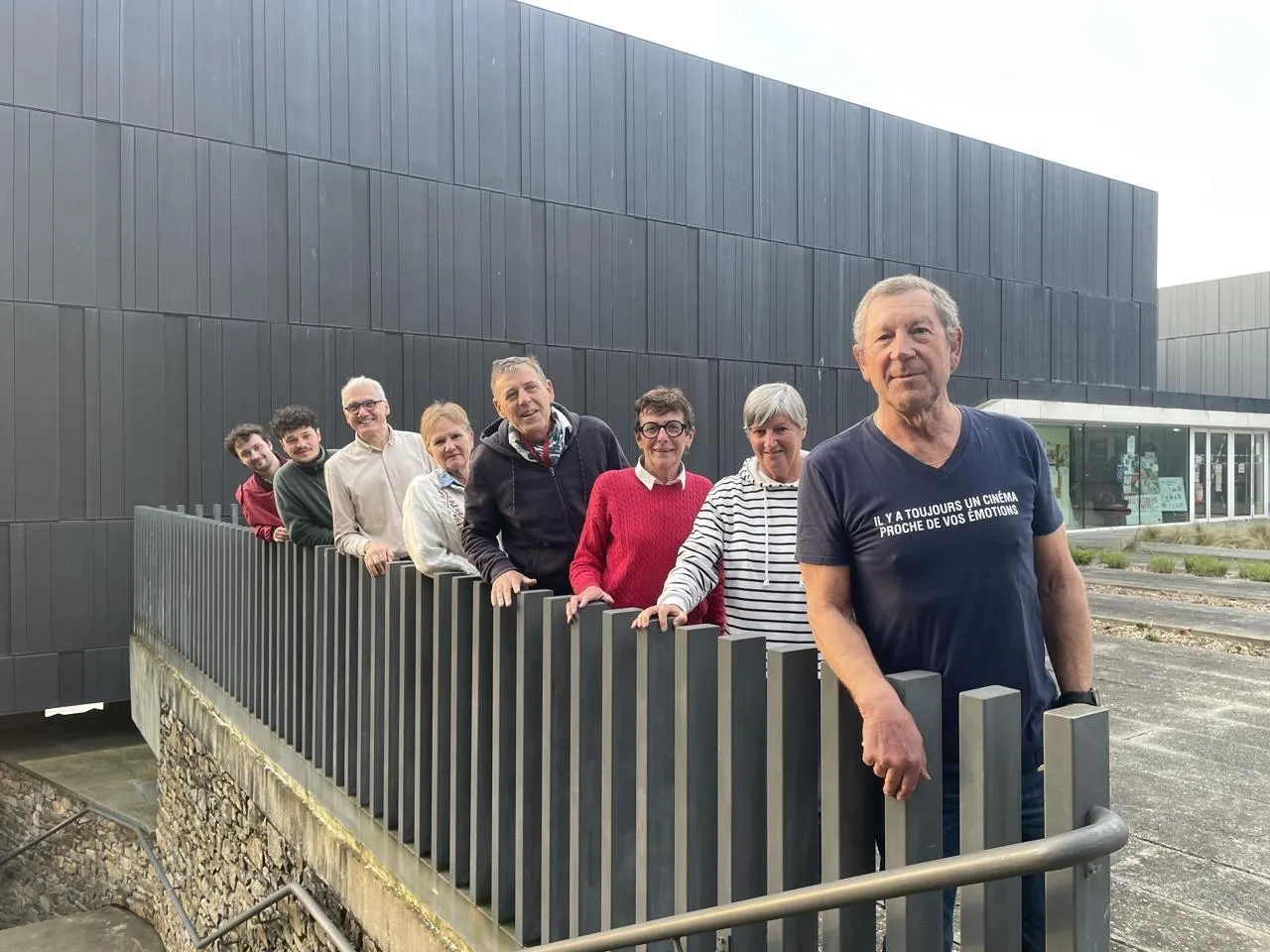 Une partie des membres de l’association du Long-Court, avec deux des DJ de System D. Ils posent devant l’esplanade où un chapiteau sera installé. © Ouest-France