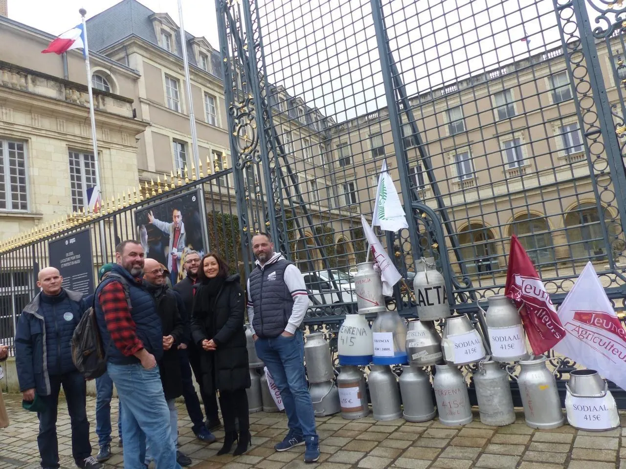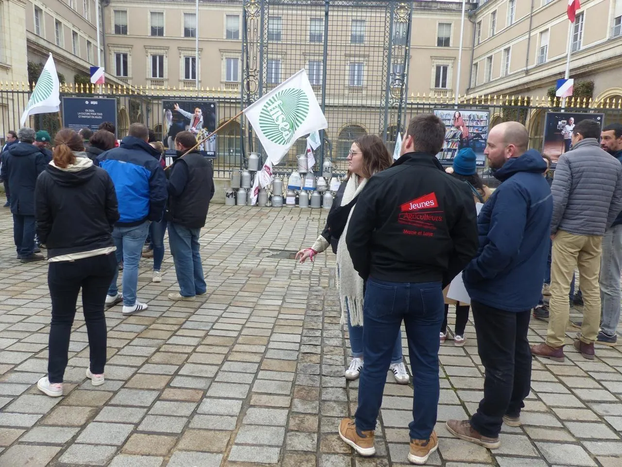 Ce mercredi 11 février 2026, une trentaine de producteurs de lait est venue « construire » un mur symbolique de bidons de lait devant la préfecture d’Angers (Maine-et-Loire).