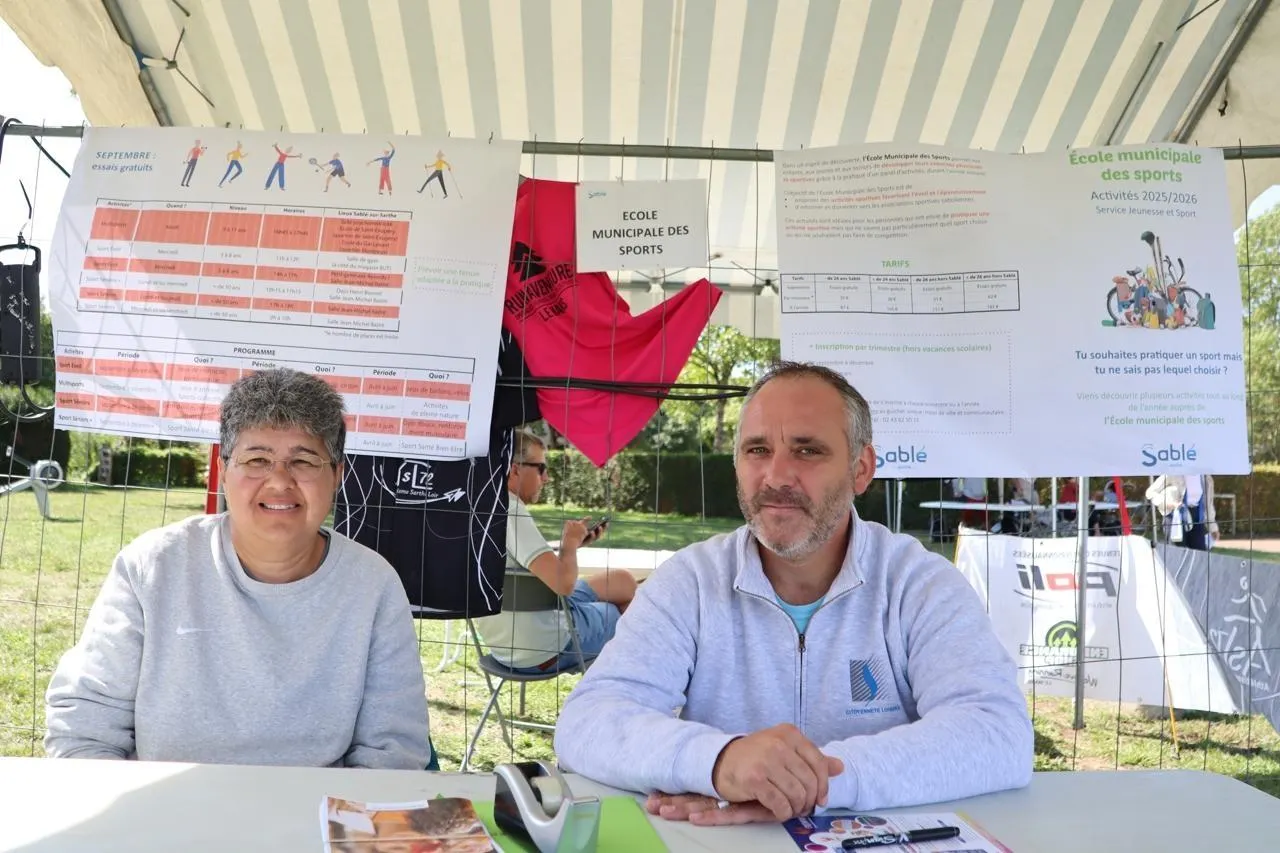 Chantal Vergé-Dépré et Christophe Tarin accueillaient le public sur le stand de l’école municipale des sports, à l’occasion du forum des activités de Sablé-sur-Sarthe, samedi 6 septembre 2025. © Ouest-France