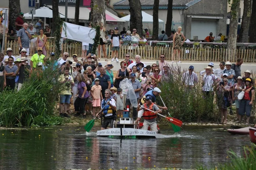 Les Sentiers de Mareil, la première des trois associations avec Monde solidaire et les Amis du moulin à mettre son radeau à l’eau sous un soleil de plomb. © Le Maine Libre