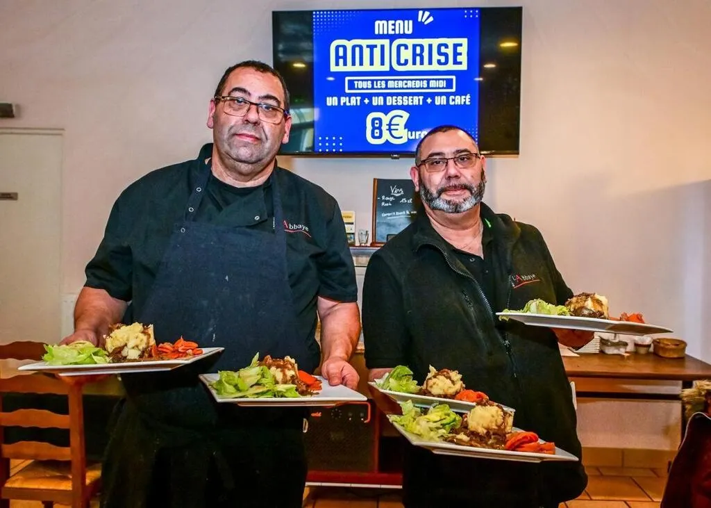 En pleine zone rurale, à Tuffé-Val-de-la-Chéronne (Sarthe), David et Christophe Smith ont lancé une formule imbattable le mercredi midi : un menu anti-crise plat-dessert-café à 8 €. Leur restaurant, Le Bistrot de l’abbaye, affiche complet. Et les retours des clients sont excellents.