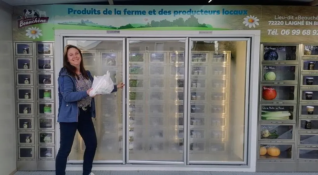 Installés à la ferme de Beauchêne (Laigné-en-Belin) depuis 2021, Céline et Anthony Follenfant ont ouvert des distributeurs le 14 septembre 2023, place Saint-Martin. Ils écoulent ainsi leurs produits mais aussi ceux de producteurs locaux.