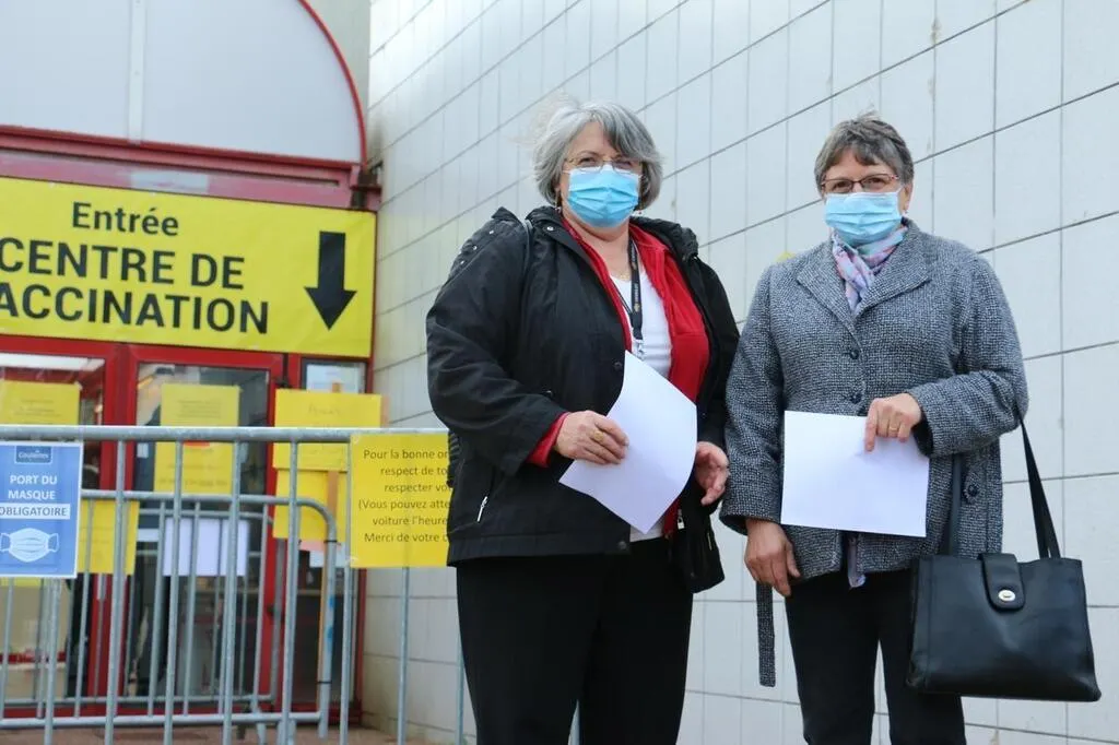 Ce dimanche 28 novembre, le centre de vaccination anti-Covid de Coulaines (Sarthe) accueillait sans rendez-vous. Bernadette (à gauche) et Élisabeth ont sauté sur l’occasion pour recevoir la troisième dose de rappel plus tôt que prévu. © Ouest-France