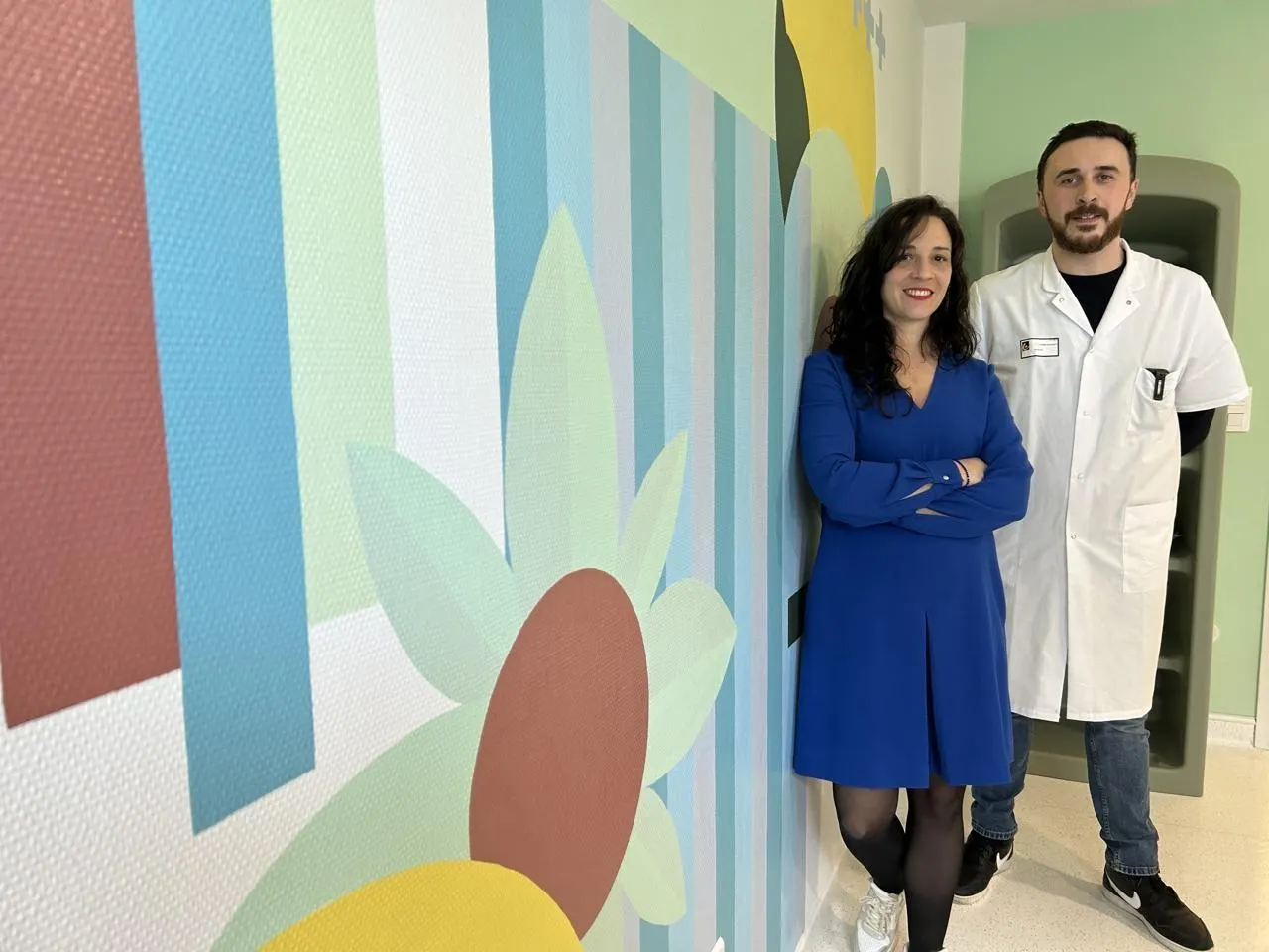 L’artiste Maggy +++ avec Maxime Garron, le cadre du service, devant la fresque réalisée début février au sein de l’espace de calme-retrait et d’apaisement de l’unité « Les Cytises ». © CO - Julien Renon