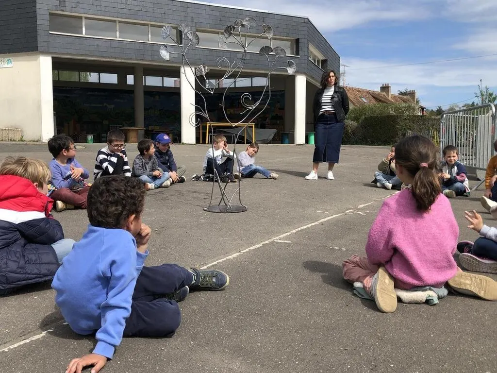 Dans le quartier de Verron, à La Flèche (Sarthe), des écoliers travaillent sur le thème du patrimoine et de la nature en lien avec un artiste local. Il vient de leur livrer une de ses créations, un arbre de vie qui restera à demeure au sein de l’école.