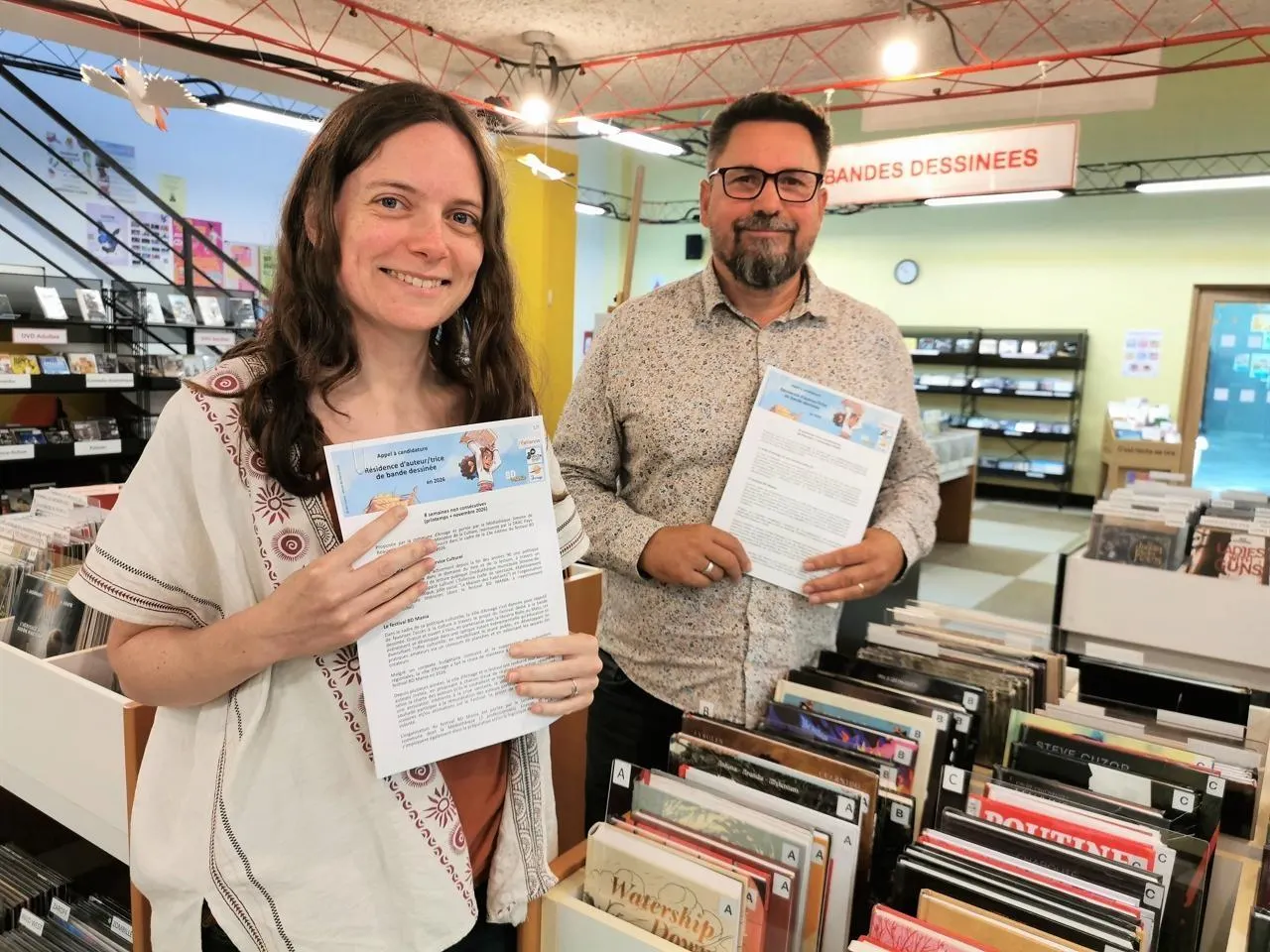 Alexandra Goubin, médiathécaire aux manettes du festival BD Mania, devenu biennale, et Laurent Charretier, élu à la culture, présentent le projet de résidence d’auteur. © Le Maine Libre