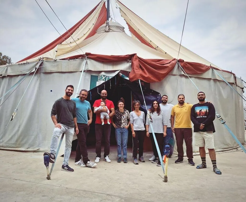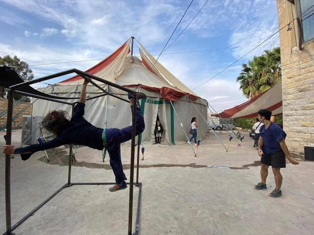Emma Verbeke (ici au centre) et quelques autres artistes de cirque français, devaient rester deux semaines à Bir Zeit, près de Ramallah, en Cisjordanie. L’attaque du Hamas les a contraints à un retour en catastrophe. © Emma Verbeke