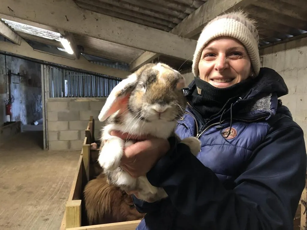 Hélène Perthue, ici avec l’un de ses lapins, a ouvert sa ferme pédagogique en septembre 2024. © Le Maine Libre