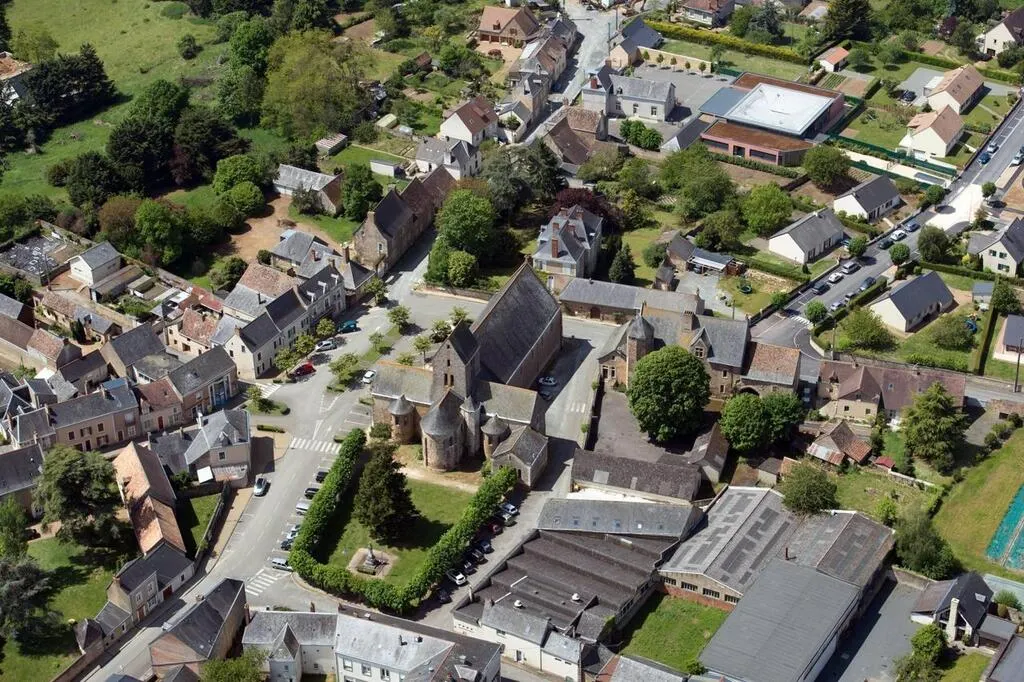 Une vue du ciel du bourg de Brûlon, au niveau de la place Gautier-Chevreuil, en 2017. © Philippe CHÉREL / Archives Ouest-France
