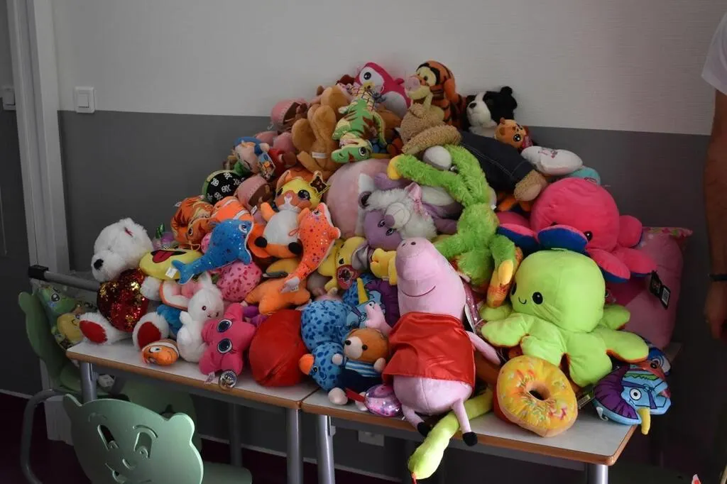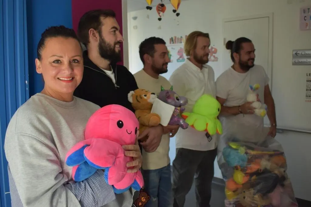 Cinq forains, accompagnés par des bénévoles des Blouses roses, ont distribué plus de 200 peluches au pôle femme, mère, enfant de l’hôpital du Mans (Sarthe), ce mercredi 23 octobre 2024.