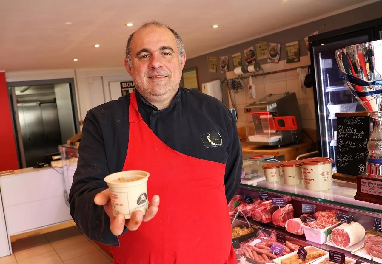 Olivier Aubert, boucher charcutier installé à Sablé-sur-Sarthe, a glané une nouvelle médaille d’or pour ses rillettes au réputé concours national des rillettes de Mamers (Sarthe), samedi 14 février 2026.