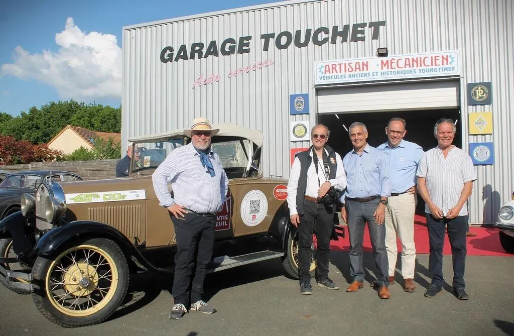 Igor Biétry pose avec sa Ford A de 1929 aux côtés de Pascal Rousselle, vice-président de la FFVE, Daniel Chevalier, maire de Juigné-sur-Sarthe, Antoine d’Amécourt, maire d’Avoise, et Christophe Touchet, garagiste président du Rétromobile club juignéen. © Ouest-France