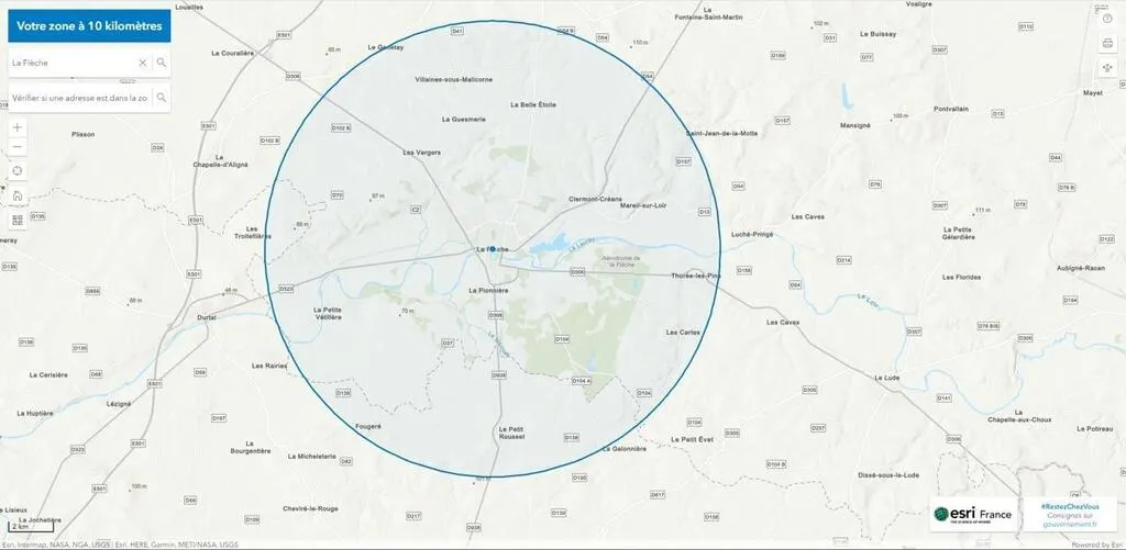 Si vous habitez La Flèche, voici un aperçu du rayon de 10 km autorisé autour de chez vous. Capture d’écran Esri France