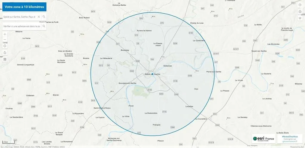 Si vous habitez Sablé-sur-Sarthe, voici un aperçu du rayon de 10 km autorisé autour de chez vous. Capture d’écran Esri France