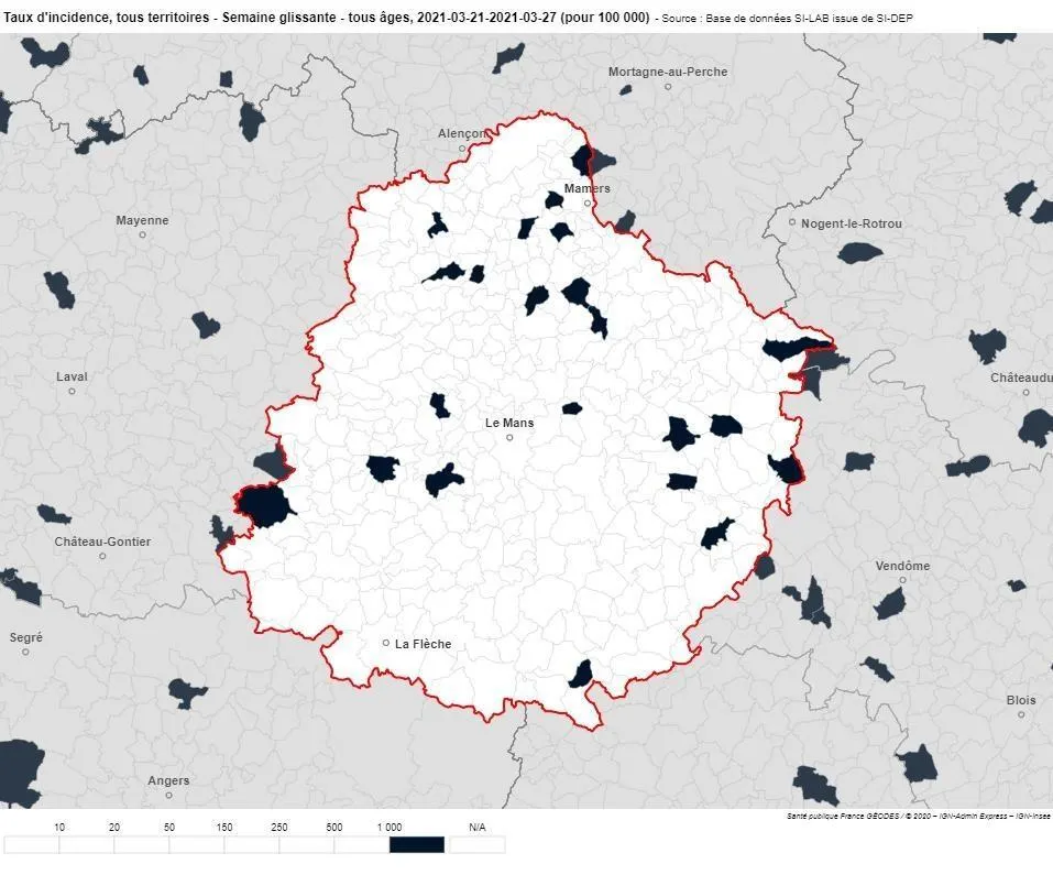Plus de vingt communes de la Sarthe enregistrent, pour la semaine du 21 au 27 mars 2021, un taux d’incidence de plus de 1 000 cas positifs pour 100 000 habitants, soit quatre fois plus que le seuil d’alerte maximale. Cela veut dire que, sur cette période, au moins une personne sur cent a été testée positive au Covid-19.