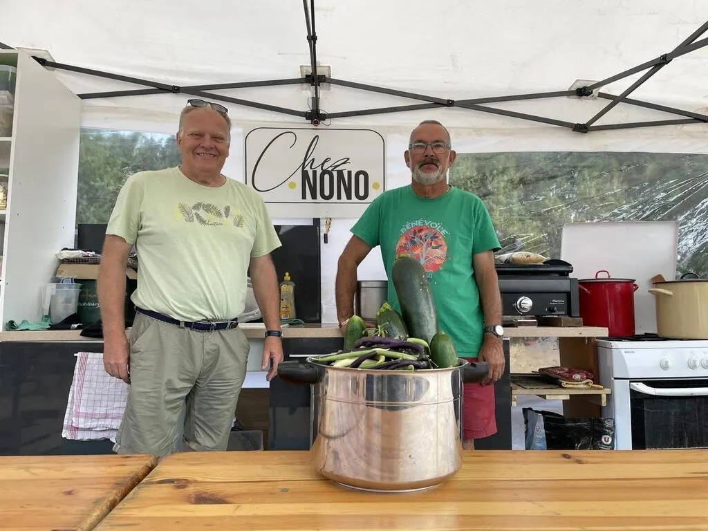 Jean-Louis Chevalier (à gauche) et sa brigade de cuistots dont Régis Clément nourrissent tous les midis les bénévoles affairés au montage du festival À Tout Bout d’Champ (18-19 juillet 2025). © Ouest-France