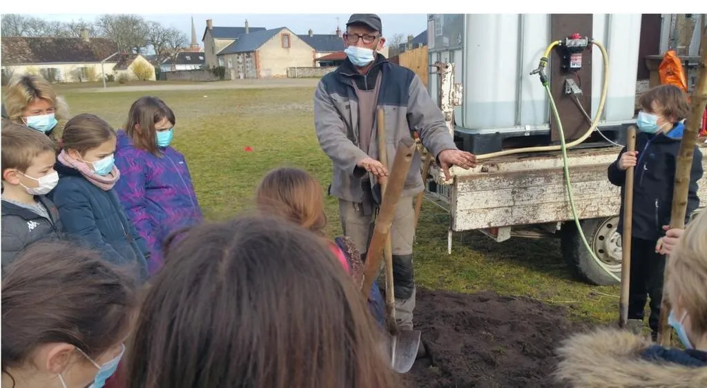 M. Choplain explique aux enfants attentifs la bonne façon de planter un arbuste. © Le Maine Libre