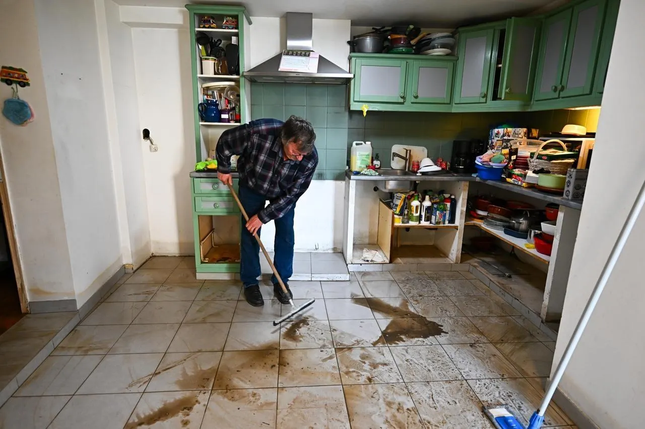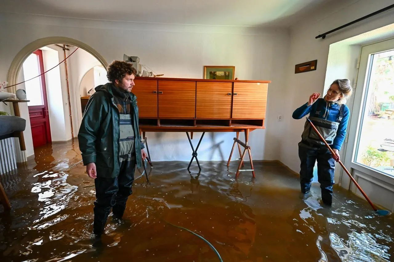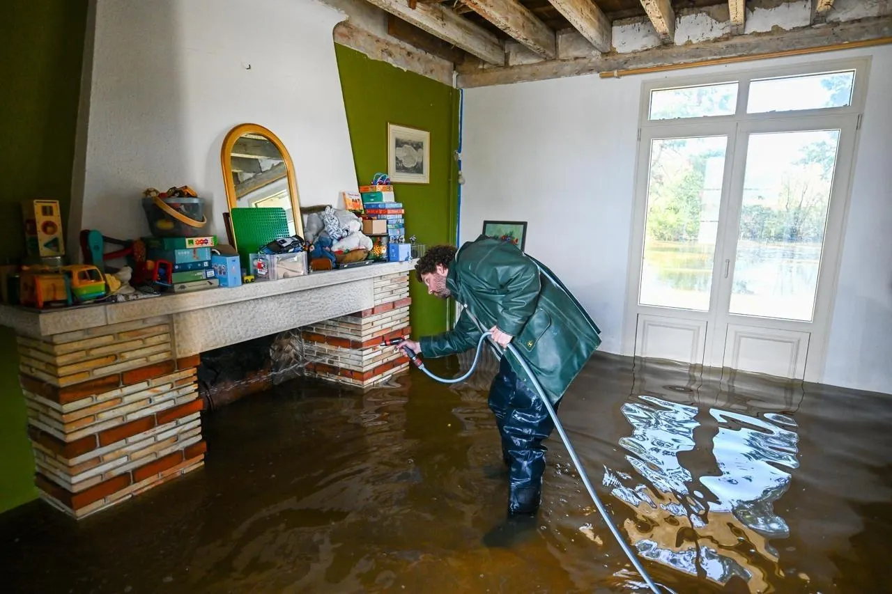 Une pellicule de boue de 10 cm recouvre le sol de la maison de Dominique et Alain, retraités et habitants de Cheffes (Maine-et-Loire) depuis leur naissance. Comme les 1 000 autres habitants du village, ils ont été contraints d’évacuer leur maison à cause des inondations. Ce mardi 24 février, ils ont enfilé leur combinaison de pêche pour voir les dégâts et récupérer un pot de confiture et quelques pommes.