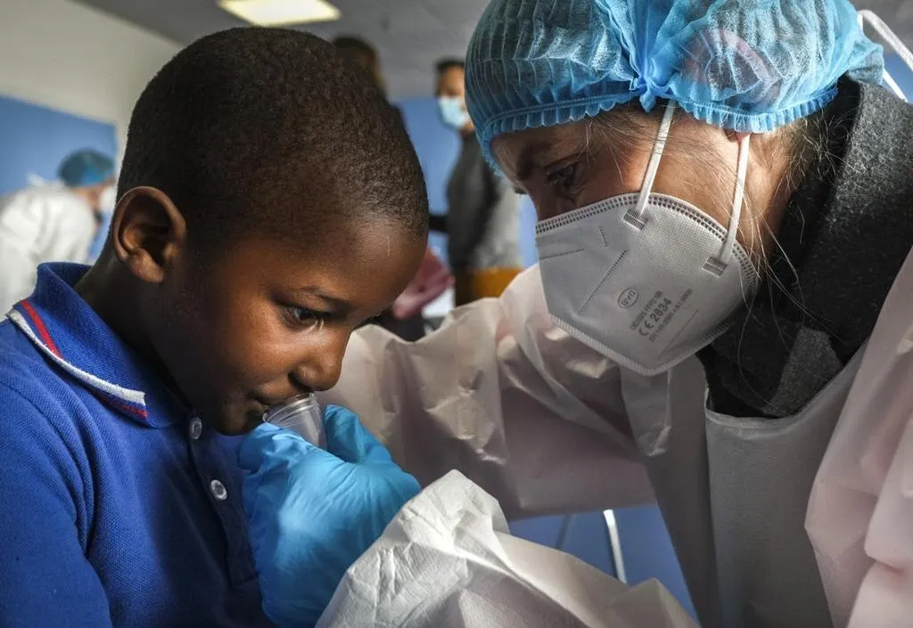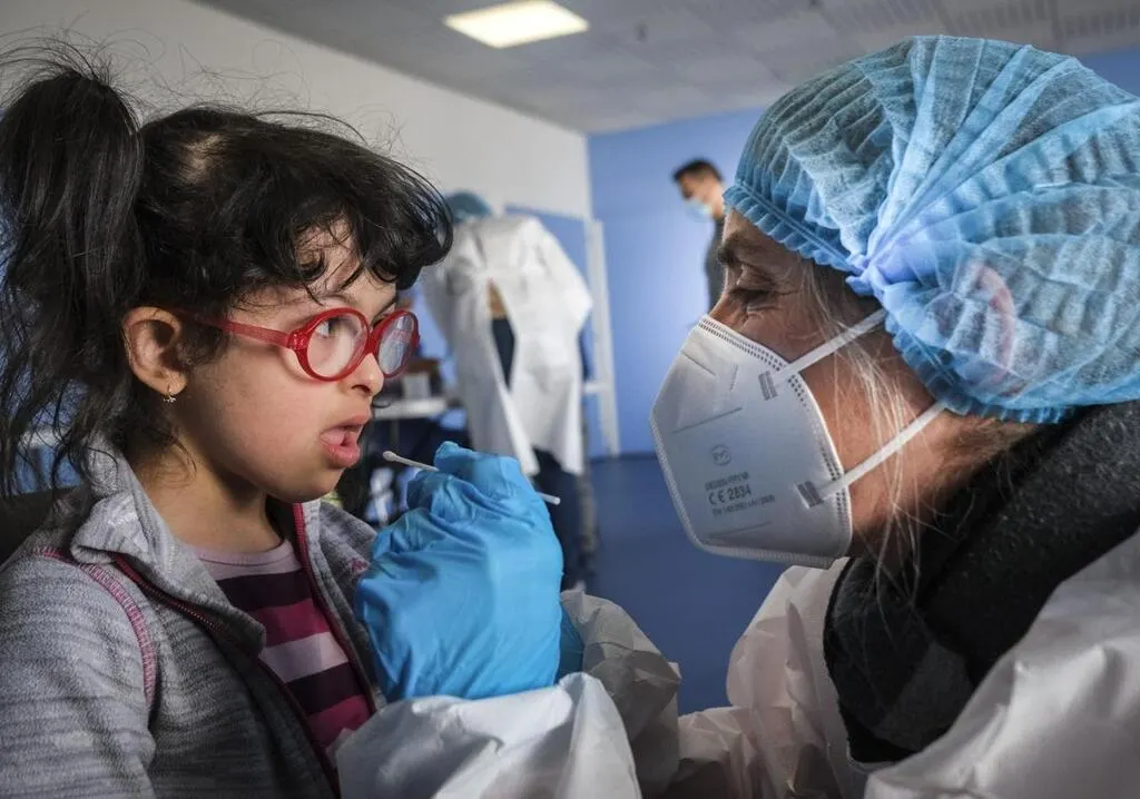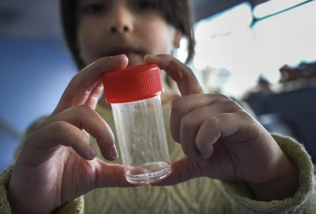Allonnes, lundi 22 mars 2021. Les enfants sont invités à cracher dans un bocal. Leurs parents reçoivent le résultat du test dès le lendemain. © Le Maine Libre – Denis LAMBERT