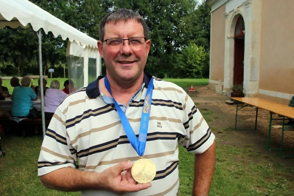 Patrick Jouenne pose avec la médaille commémorative au cordon bleu, couleur associée à la sainte Vierge. Les logos des entreprises de charpente figurent au dos de la médaille. © Le Maine Libre
