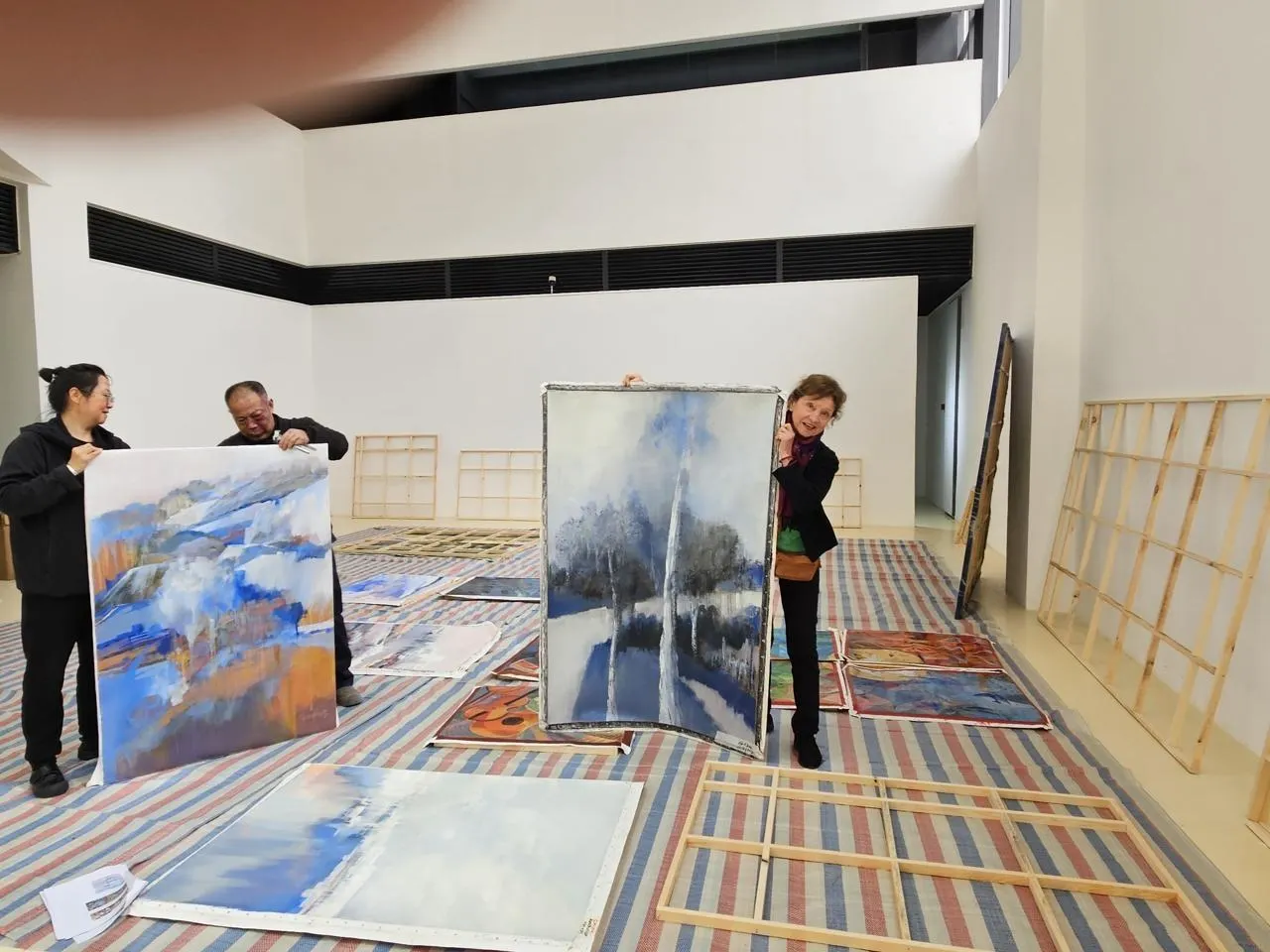 Michèle Gosnet-Frassetto lors de l’accrochage, au musée de Chengdu, début mars. © Photo fournie par l’artiste