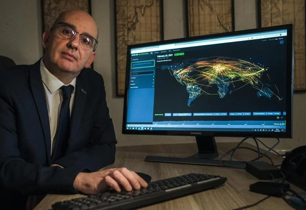 Duneau, mardi 23 février 2021. Vincent Trély, directeur associé du cabinet Weliom et président de l’Association pour la sécurité des systèmes d’information de santé. Sur son écran : les cyberattaques en cours dans le monde. © Le Maine Libre – Denis LAMBERT