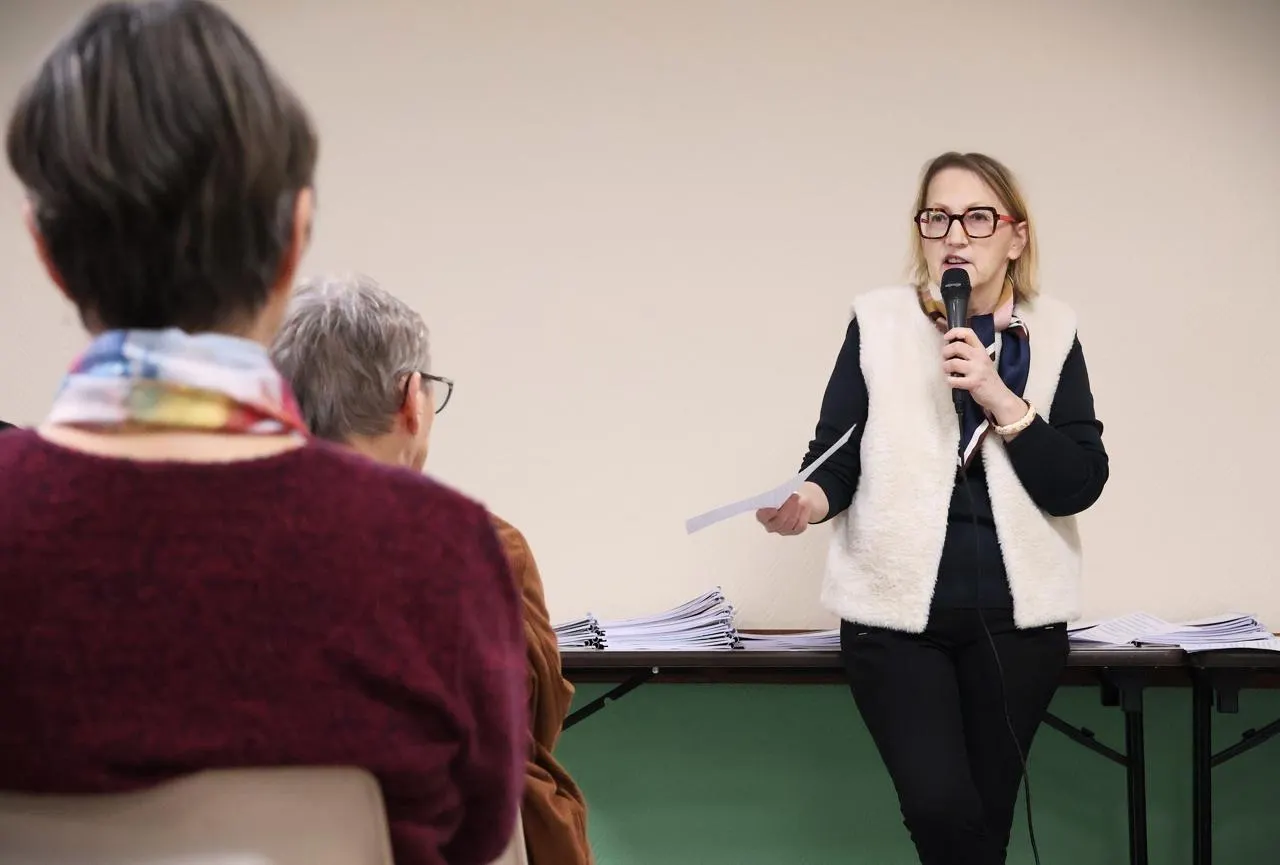 Nicole Foucault, lors de ses vÅ“ux, dans la salle des fêtes de Pincé, vendredi 23 janvier 2026. © Ouest-France