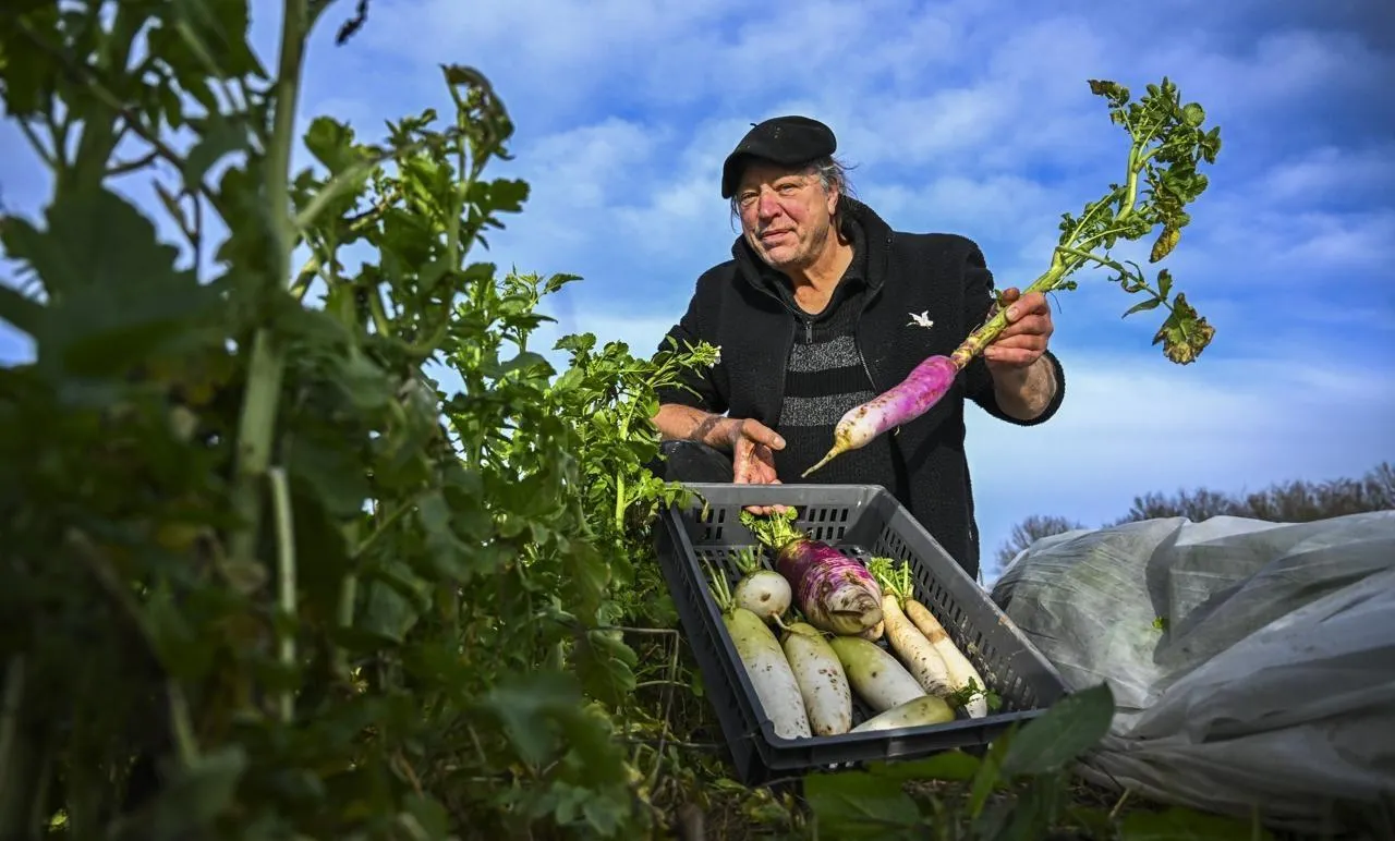 Noël Lahaye-Morin produit une quantité infinie de légumes anciens à Prévelles (Sarthe). Parmi eux, le méconnu radis daïkon, emblématique au Japon. Un compromis entre piquant et douceur.