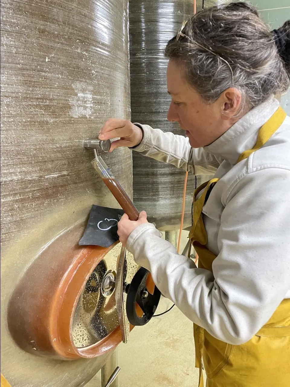 Sophie Ammann mesure la densité du jus en fermentation dans les nouvelles cuves. © Le Maine Libre