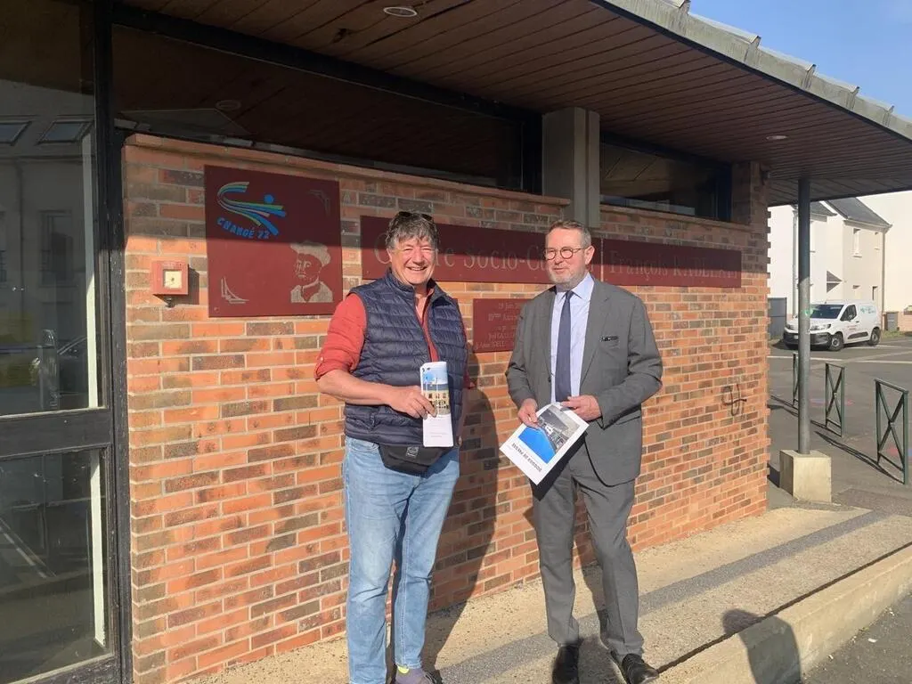 Yves-Marie Hervé, maire de Changé et Arnauld de Saint-Riquier, adjoint à la transition énergétique, lancent les travaux de rénovation du centre Rabelais. © Ouest-France
