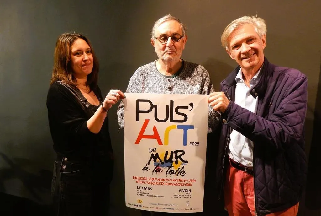La peintre Claire Emond, Lucien Ruimy, du FIIA, l’un des créateurs de Puls’Art et Jérôme Dauchez du Prieuré de Vivoin viennent nous présenter l’édition Puls’Art 2025. © Ouest-France