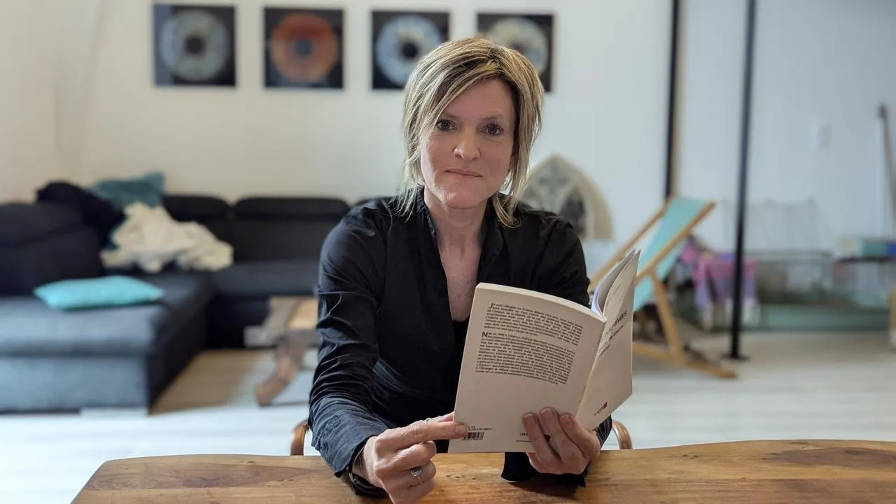 Karine Houël tenant dans ses mains un recueil de la poétesse iranienne Mahtab Ghorbani. © Ouest-France