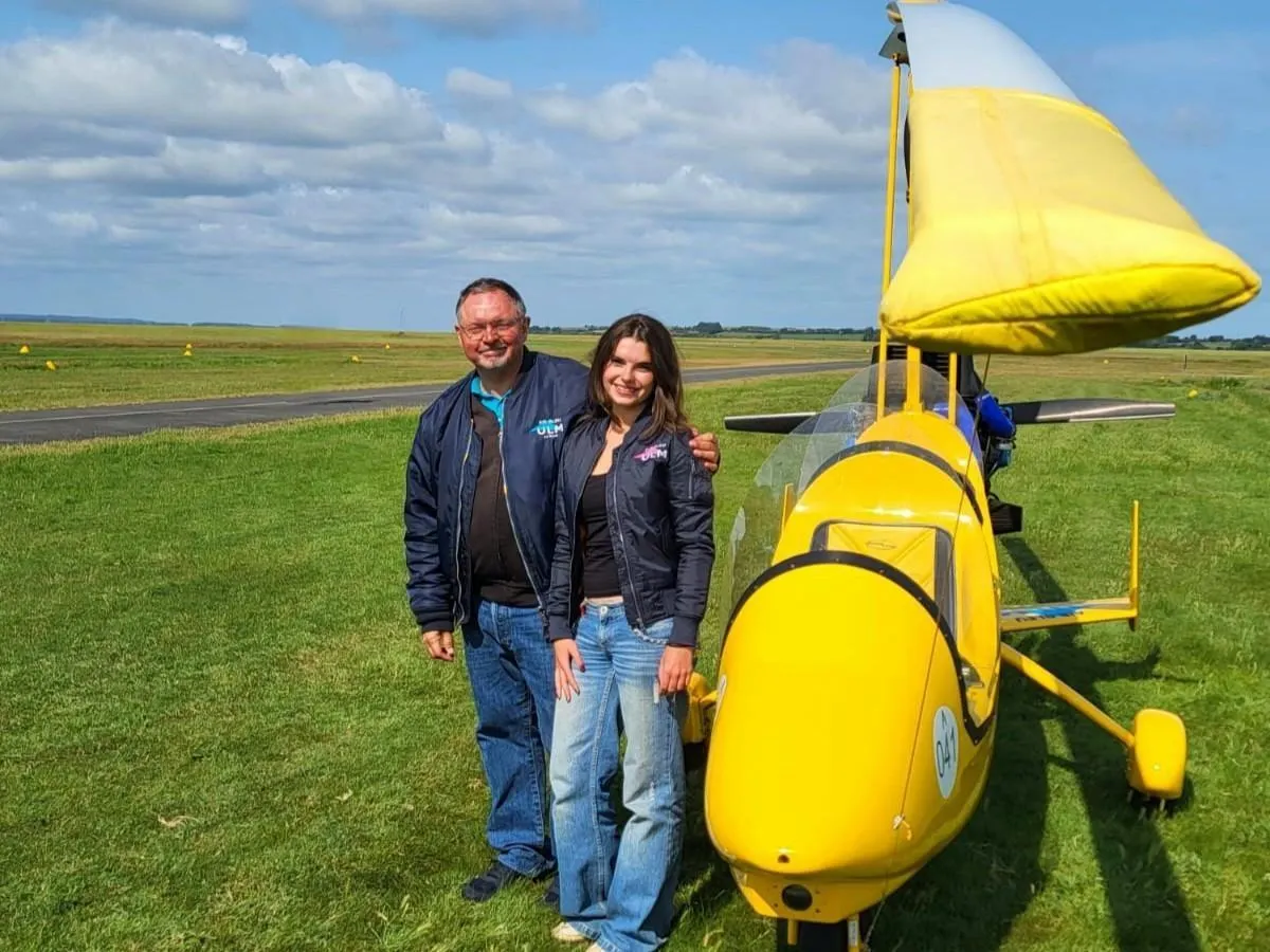 David Morin, moniteur au Mans et Diane, 16 ans, avant de s’envoler pour une nouvelle étape du tour de France ULM 2025. © Diane Selingant