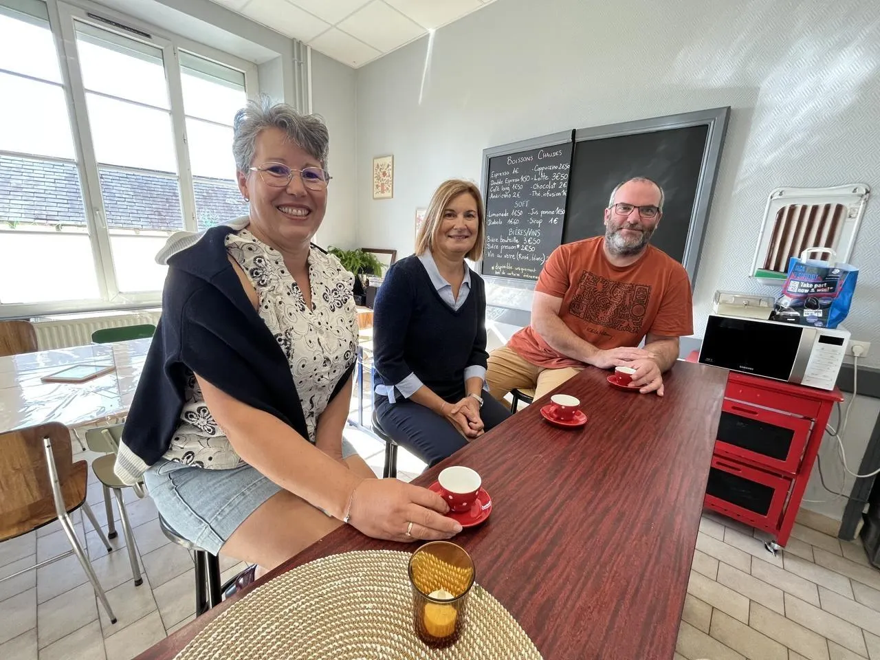 Nathalie Leroy-Duprey, Mathilde Plu, Ronan Houssin dans le café associatif installé dans l’ancienne mairie de Saint-Gervais-en-Belin. © OUEST-FRANCE.