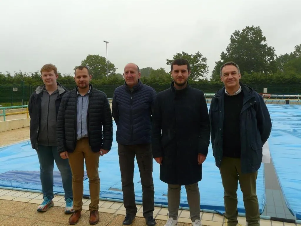 Marius Trouillet, Fabrice Goyer Thierry, Francis Lods, Quentin Levrard et Frédéric Lamperière sont prêts pour l’ouverture imminente de la piscine. © Le Maine Libre