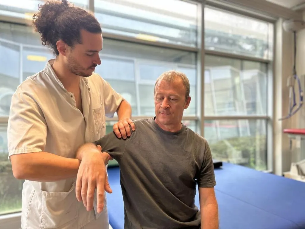 Olivier Mallet avec son kiné. Depuis début août 2024, il est en rééducation au Centre de l’Arche, près du Mans (Sarthe). © Ouest-France