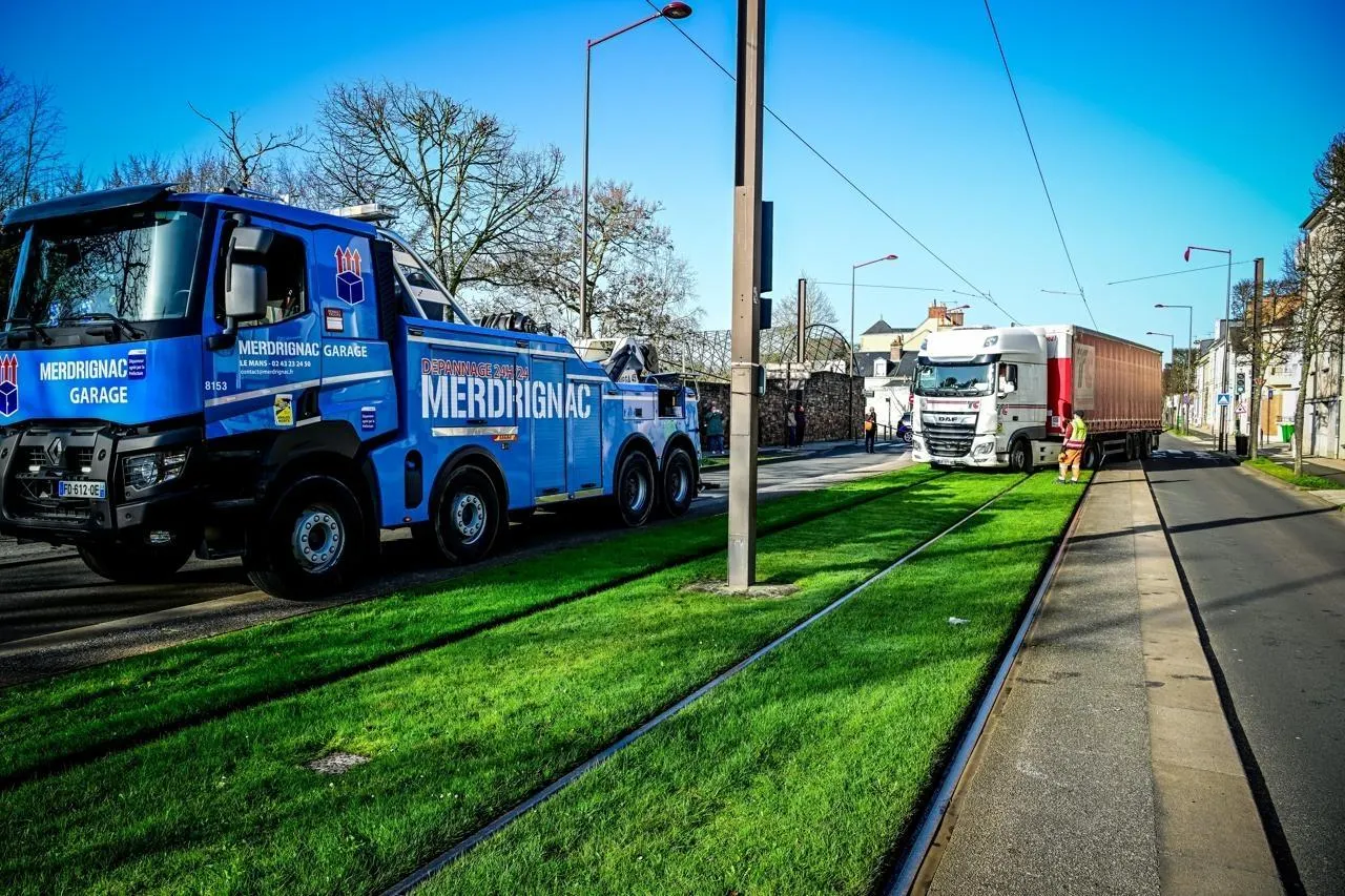 Un poids lourd s’est retrouvé coincé au milieu des rails de la ligne T1, ce mercredi 25 février 2026 au matin au Mans, avenue Rubillard, à la suite d’une mauvaise manœuvre.