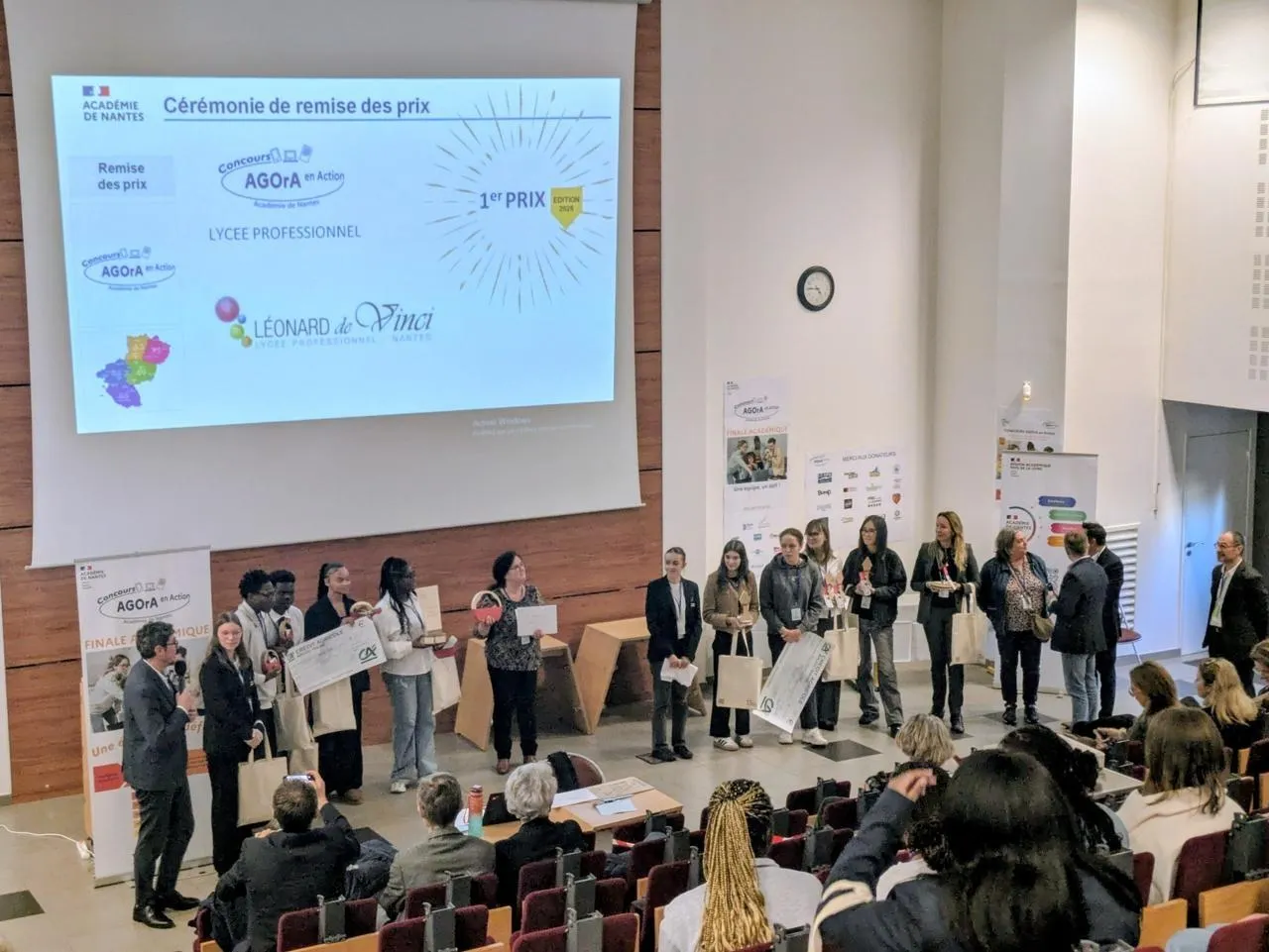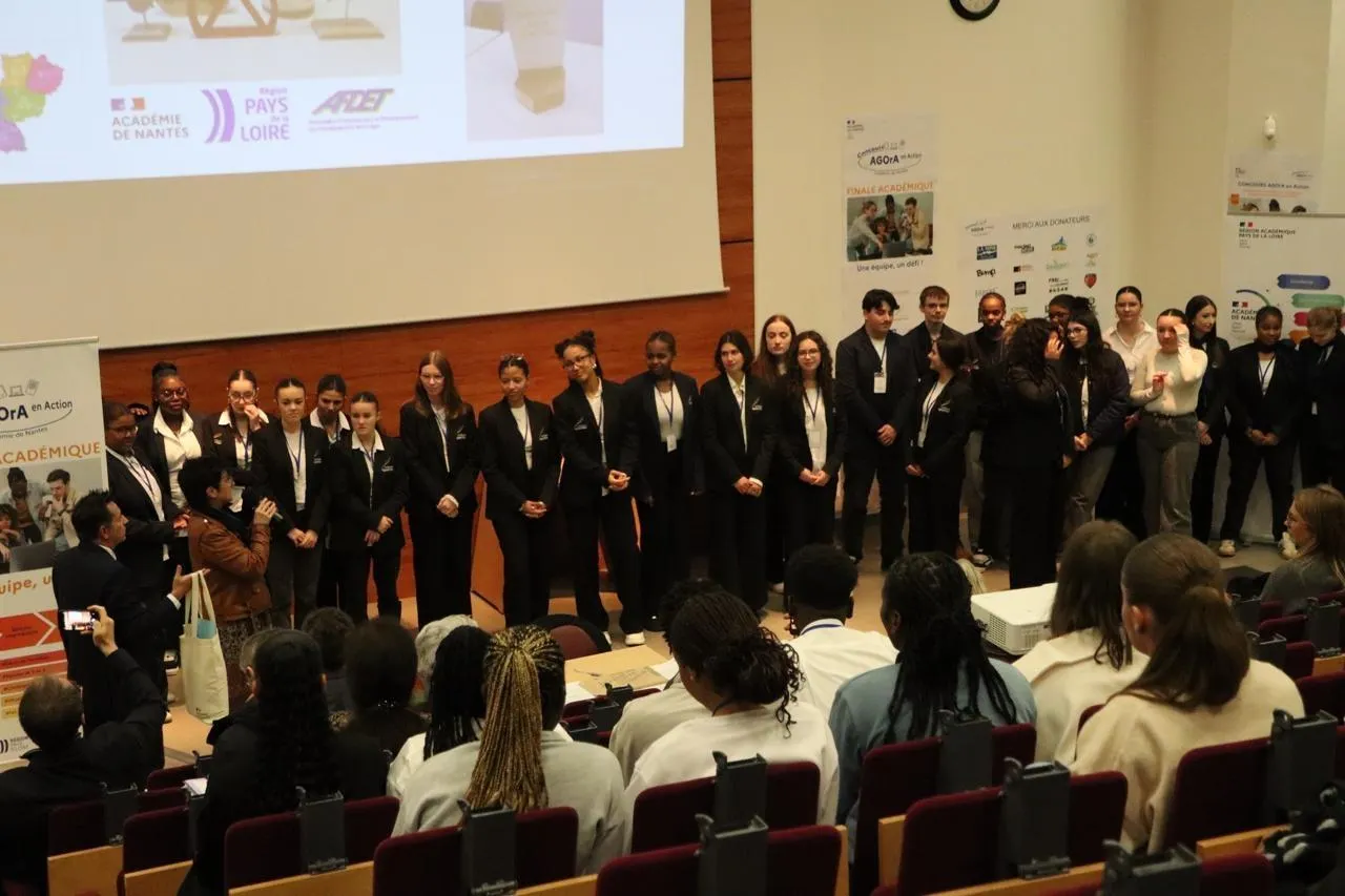 Les élèves du lycée Léonard de Vinci ont remporté la 1re édition du concours AGOrA en action organisé au lycée Raphaël-Elizé de Sablé-sur-Sarthe, jeudi 4 décembre 2025. © Académie de Nantes