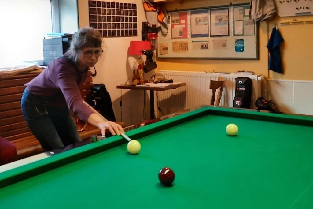 Carole Riollet, seule adhérente femme au club de billard de La Flèche (Sarthe) se penche sur le tapis vert d’un des deux billards du club : « Je peux passer de longs moments à répéter un coup. » © Ouest-France