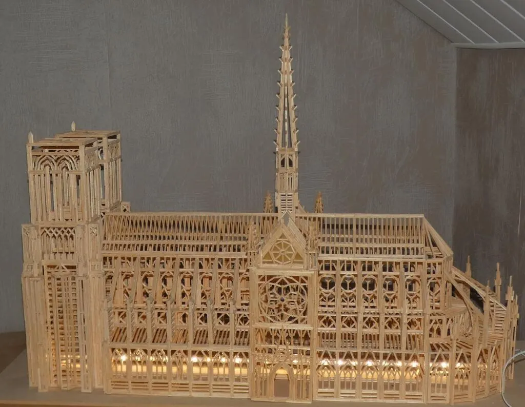 Depuis qu’il a pris sa retraite il y a douze ans, il s’est mis à confectionner, à partir de plans trouver sur internet ou réalisé par lui-même, des maquettes en allumettes. Il a construit un moulin, un train, une grande roue, la Maison Blanche ou encore l’Arc de Triomphe et bien sûr la cathédrale Notre-Dame-de-Paris.