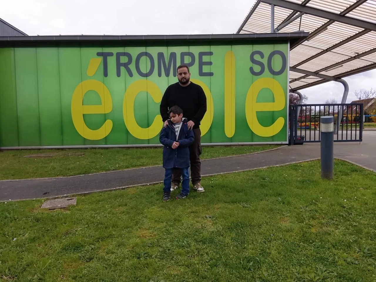 Hamid Raffas et son fils, Ali, devant l’école de Saint-Georges-du-Bois, près du Mans (Sarthe). © Hamid Raffas