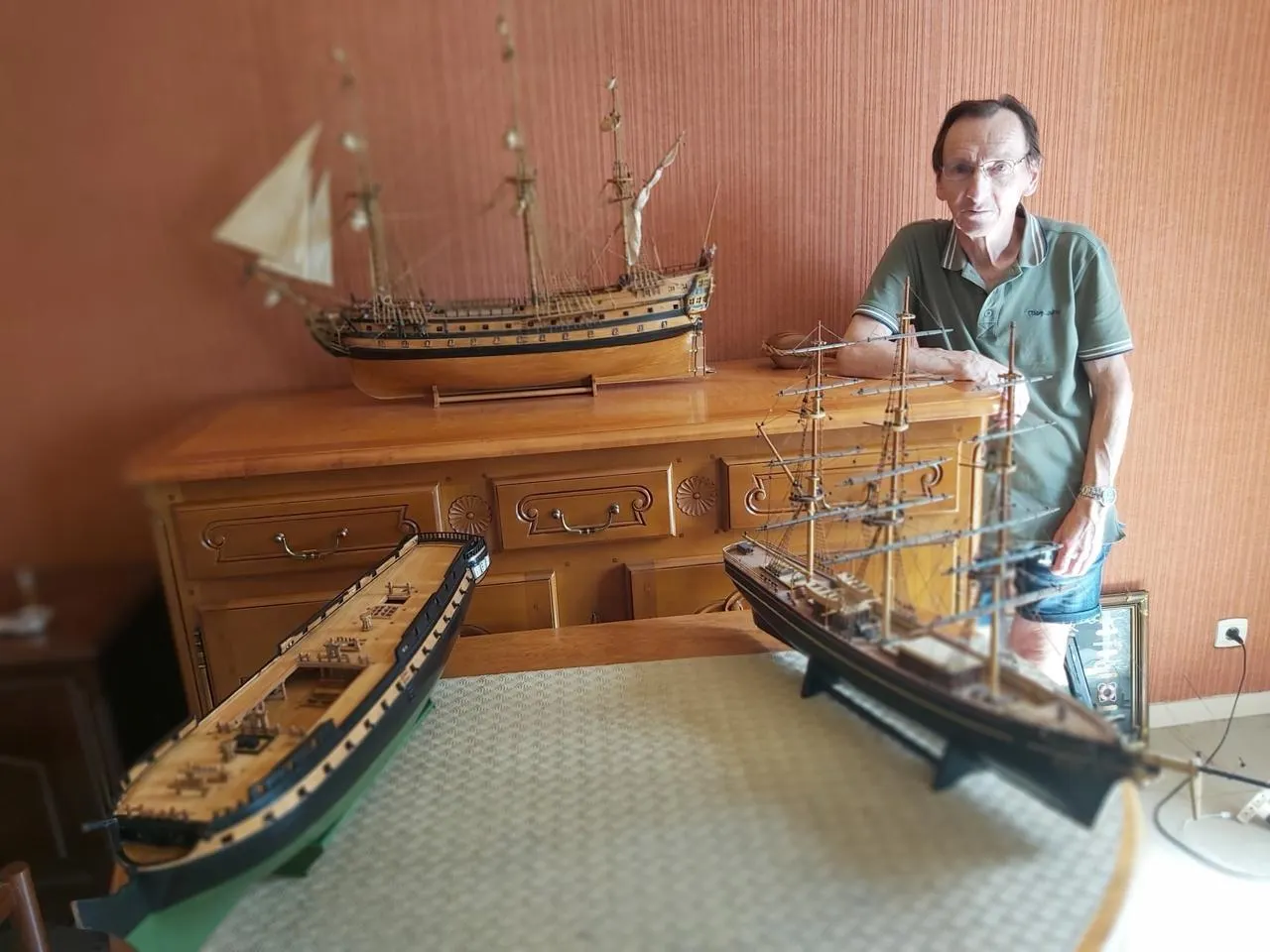 Pierre Milot et ses trois maquettes : La Renommée, Le Vengeur et le Cutty Sark. © Le Maine Libre
