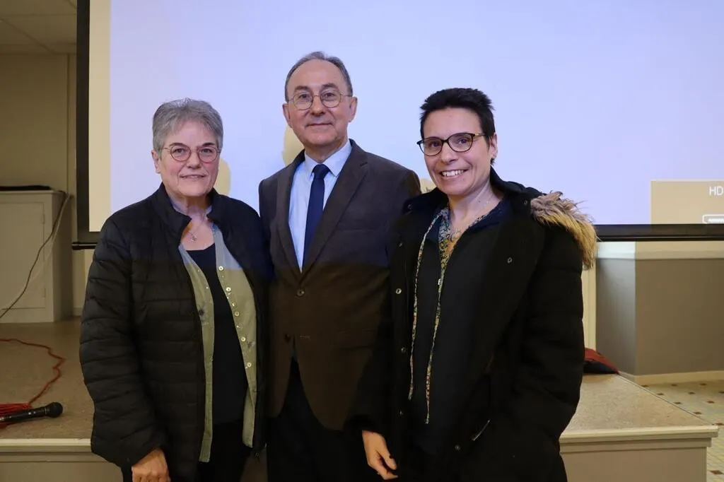 Claude Davy, le maire de Notre-Dame-du-Pé, entouré par Ghislaine Legendre (à gauche) et Audrey Sourice (à droite), lors de la cérémonie des vÅ“ux 2025. © Ouest-France