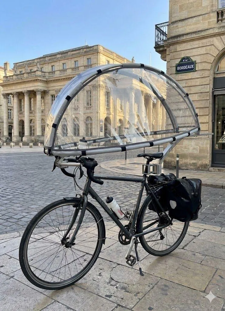 Inventeur d’Ubulle, une protection cycliste contre la pluie qu’il souhaite breveter, le Sarthois Samuel Vallienne roule à vélo de Bordeaux à Amsterdam. Il fait halte à Sablé (Sarthe) le vendredi 20 et le samedi 21 mars 2026.
