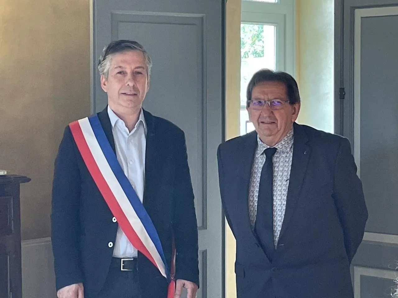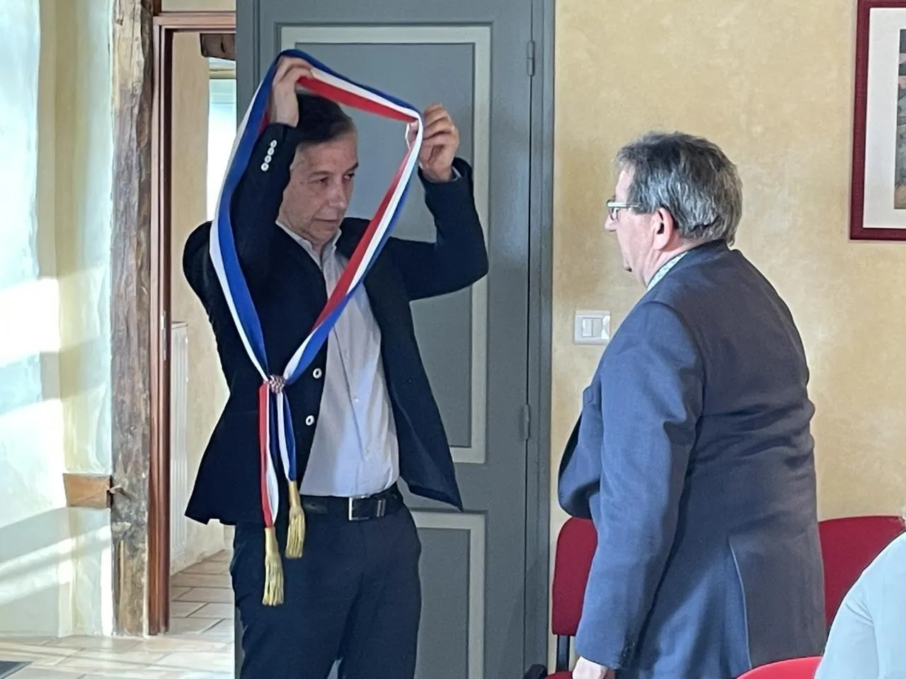 Le maire élu par son conseil reçoit l’écharpe des mains de son prédécesseur. © Le Maine Libre