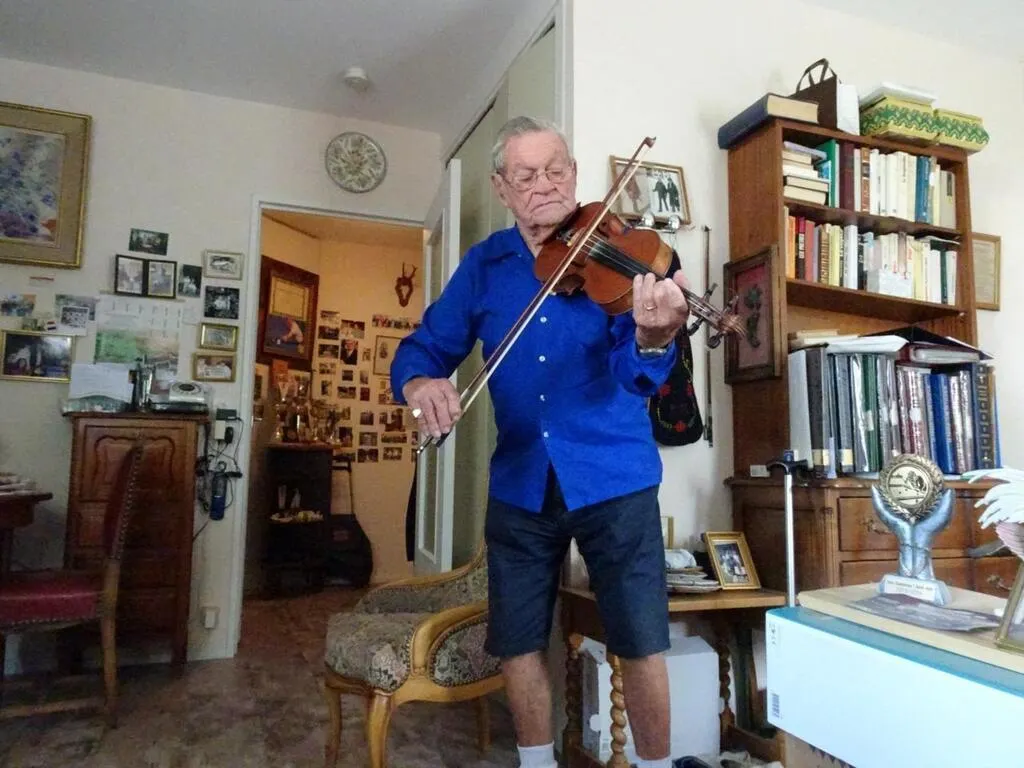À Coulaines, près du Mans (Sarthe), l’ancien boulanger et industriel Roger Maudet a eu 100 ans le 22 juillet 2023. Il joue du violon depuis l’âge de 4 ans. © Ouest-France