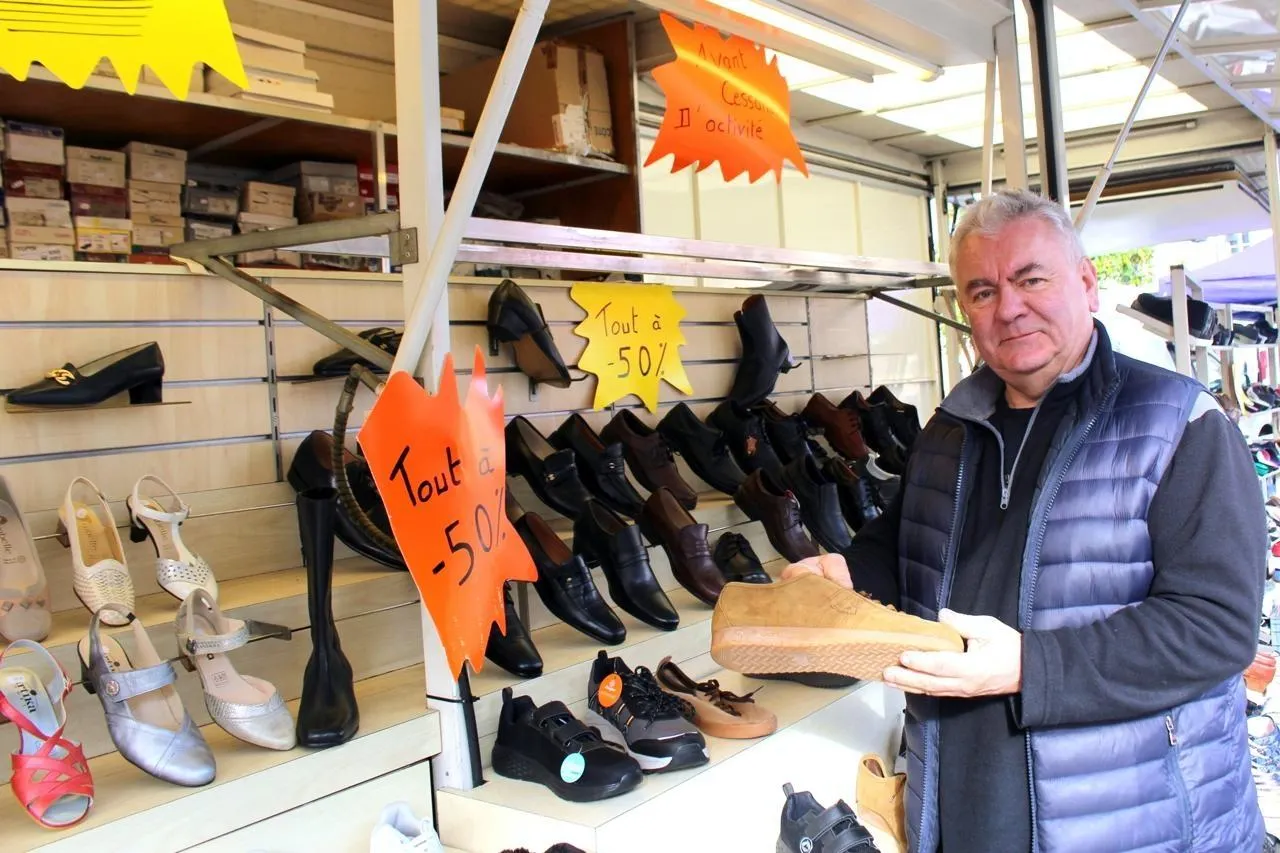 Avant de prendre sa retraite, Patrice Gautier écoule son stock de chaussures. Il fait cinq marchés par semaine : le mardi à Écommoy, le mercredi à La Flèche, le jeudi au Lude, le samedi à Montval-sur-Loir et le dimanche à Mayet.