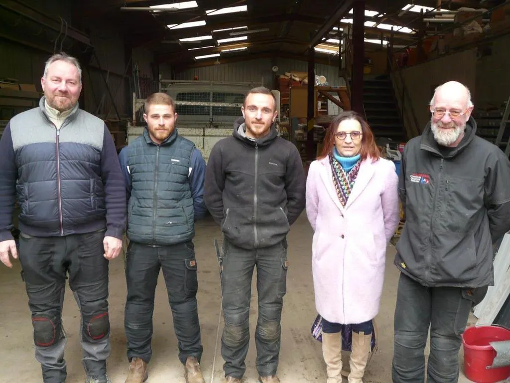 David Jarry et Arnaud Bruneau entourent les salariés, Evan et Dylan, et Nathalie, épouse d’Arnaud. © Le Maine Libre