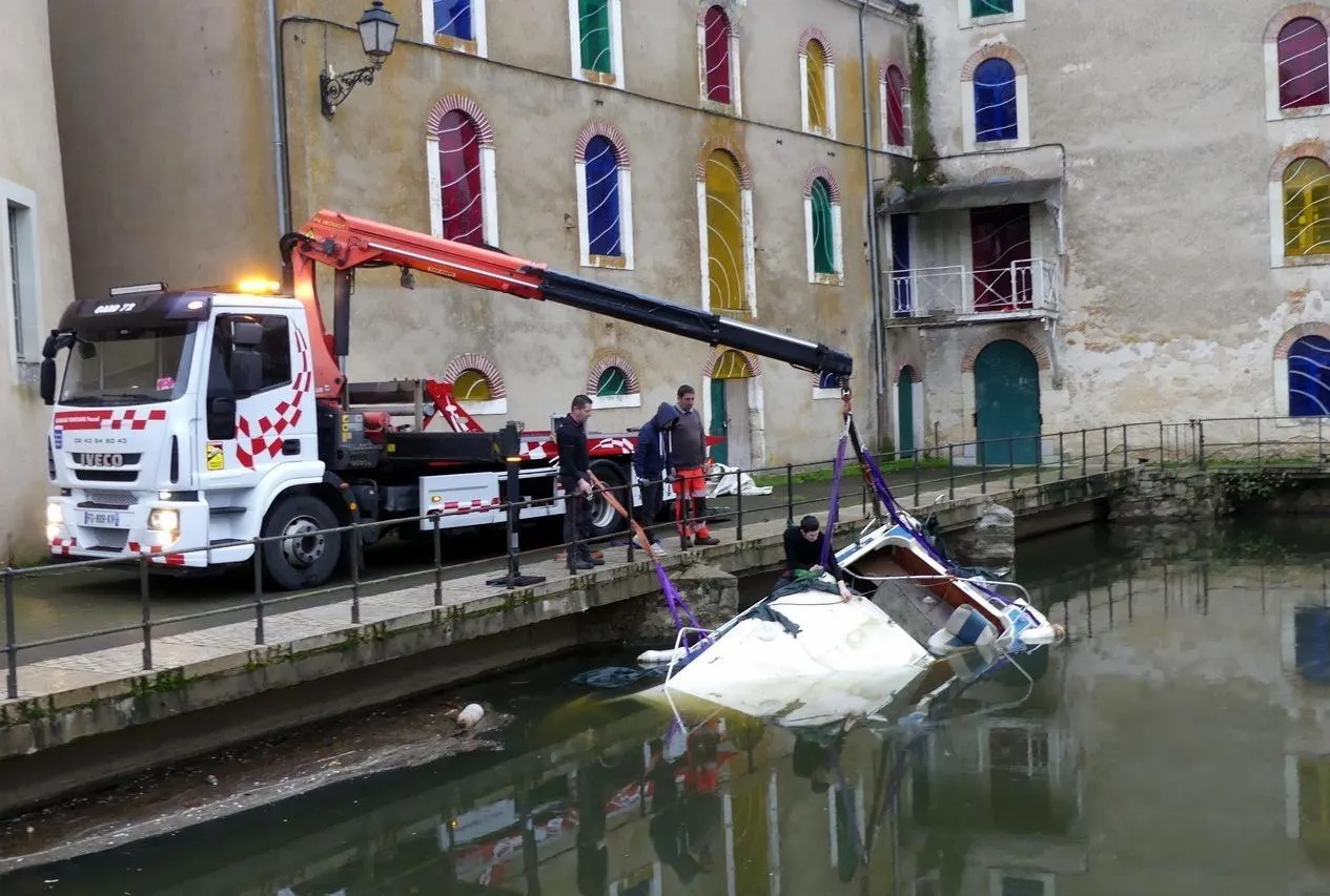 Mardi 23 décembre 2025, un garagiste a procédé à l’enlèvement d’un bateau coulé dans le port de Malicorne-sur-Sarthe. Déjà couché sur le flanc au moment des écourues, il avait ensuite dérivé vers le pont et le barrage.