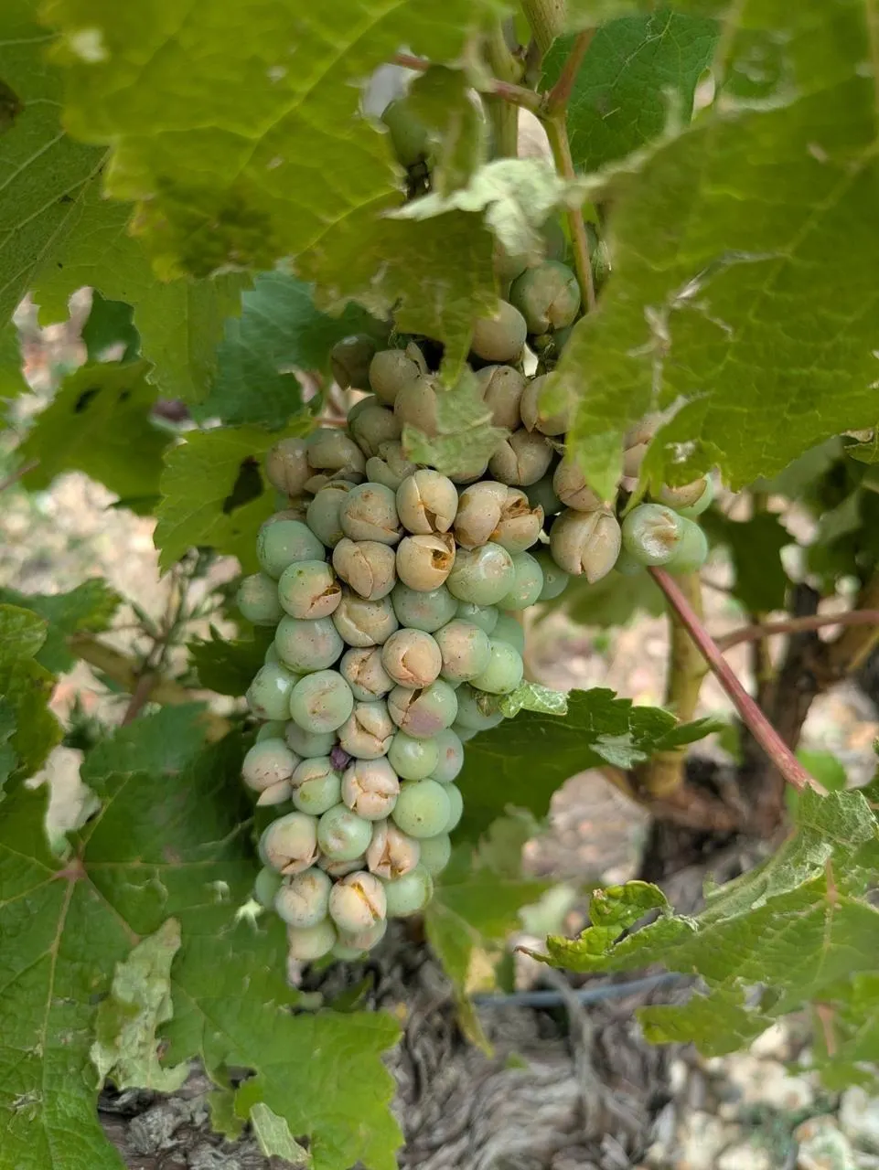 Le raisin blanc a été fendu par la grêle, la pluie et le vent, sur les parcelles du Domaine Lelais, sur les hauteurs de Lhomme, dans le sud-est de la Sarthe. © Domaine Lelais